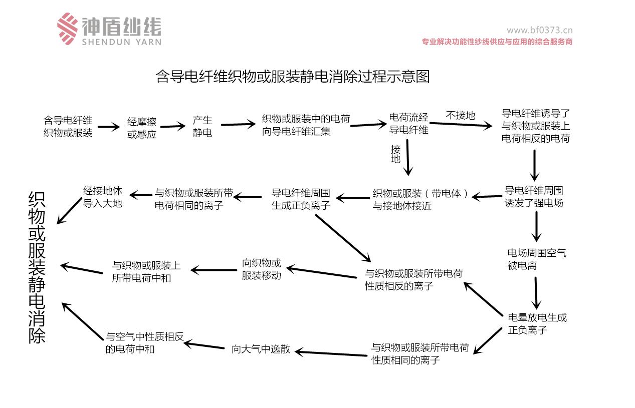 在電暈放電的同時,誘導電荷聚集在導電纖維的周圍,進而泄露入大地。當帶電體(織物或服裝)與接地的導電纖維接近時,在導電纖維周圍生成正負離子,其中與帶電體所帶電荷相反的離子向帶電體移動而中和,與帶電體所帶電荷相同的離子通過導電纖維向大地泄露,靜電消除。