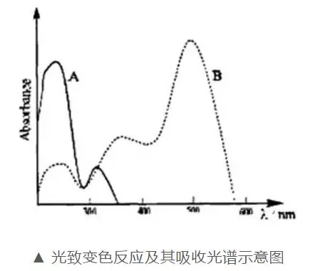 一個化合物(A)在受到一定波長的光照下,進行光化學反應,生成產物(B),由于化合物結構的改變導致其吸收光譜發生明顯的變化即發生顏色變化,而在另一波長的照射下(或熱的作用下),又能恢復到原來狀態的現象。就是說某一物質在兩種狀態之間的可逆變化,其中至少有一個方向的變化是由光輻射引起的。
