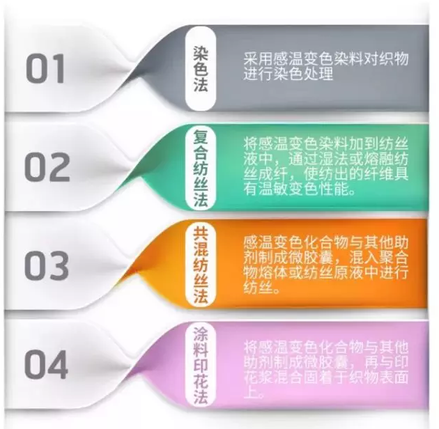某些溫敏材料是結晶物質,加熱到一定溫度其晶型發生變化,從而導致顏色改變,冷卻至室溫后,晶型恢復,顏色也隨之復原。 另一些有溫敏性能的有機物,由于溫度變化會引起部分結構、pH 、結晶水、電子數的變化或達到熔點后物質體系的顏色發生變化。 將這些物質引入纖維和紡織品即制得可以實現從“有色==無色”狀態的顏色變化的織物。