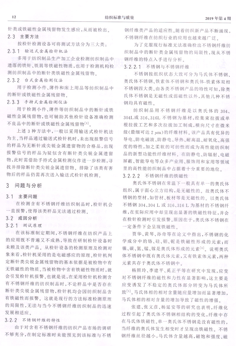 2019年8月25日出版的《紡織標準與質量》(A類學術期刊)2019年第四期發表的“紡織制品檢針檢測現行標準局限性初探”一文,從紡織制品檢針檢測概況、檢針檢測的原理和不銹鋼纖維的特性諸方面分析、較為全面的探討了其原因。